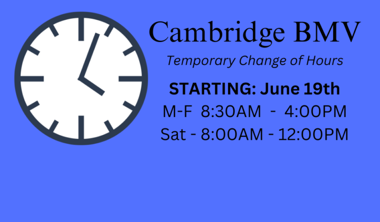 Beginning Monday June 19th, due to a temporary staffing shortage, the operating hours of the Ohio Bureau of Motor Vehicles’ Cambridge License Bureau will be changing: The BMV will be open Monday through Friday from 8:30 AM until 4:00 PM and Saturdays from 8:00 AM until 12 Noon.  These temporary hours will take effect June 19th and are only expected to last for six weeks.