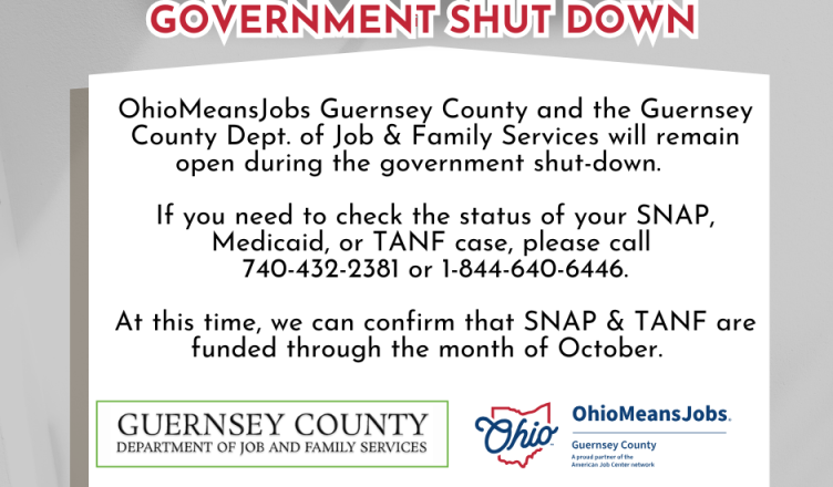 OhioMeanwsJobs Guernsey County and the Guernsey County Dept. of Job & Family Services will remain open during the government shut-down.